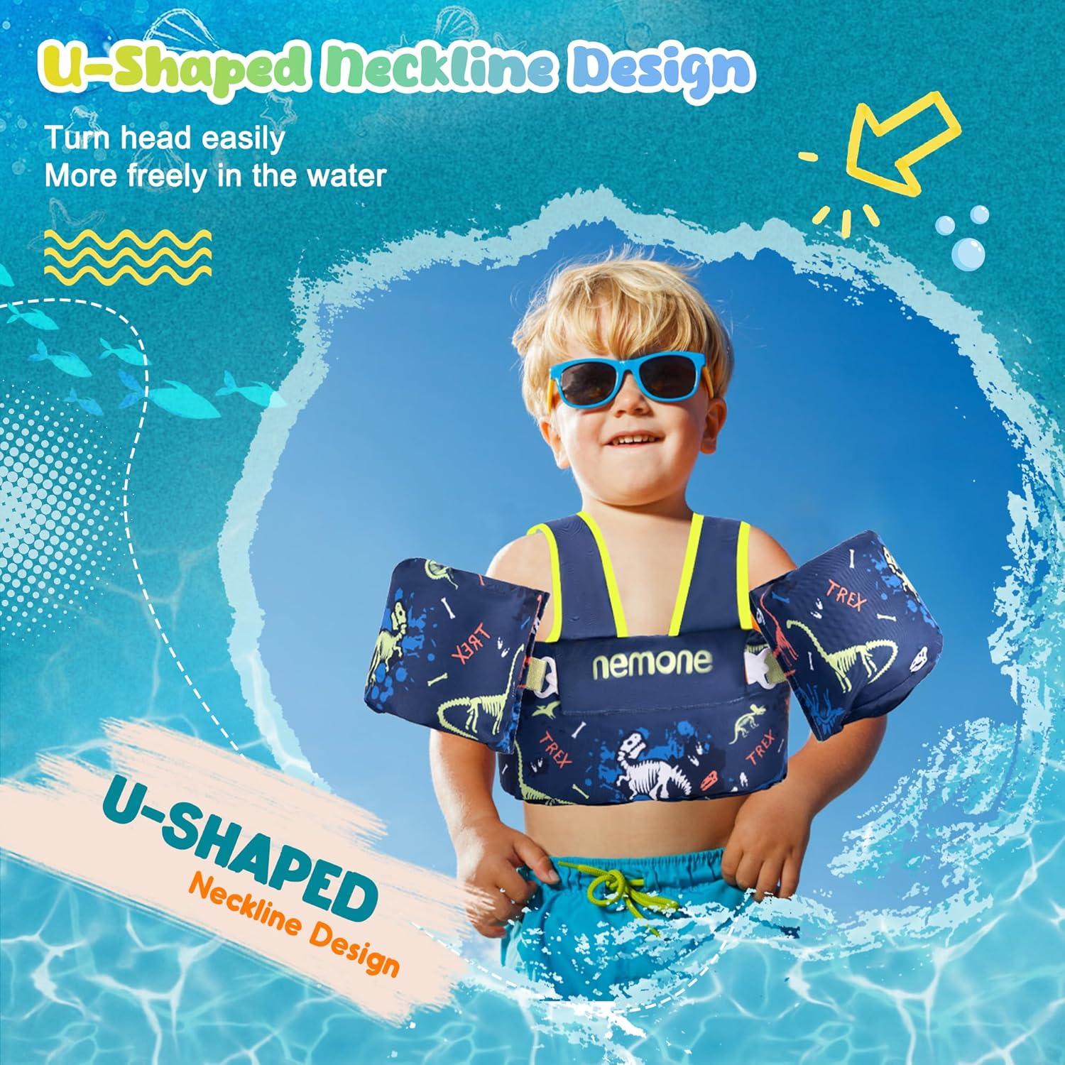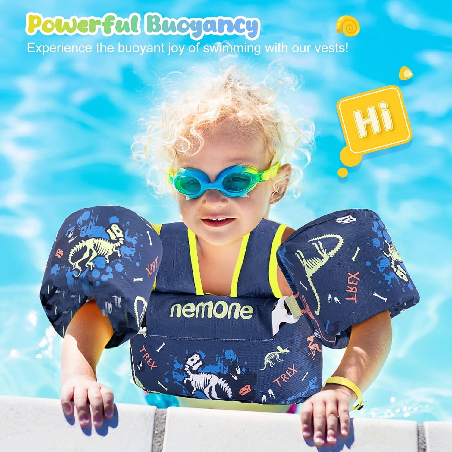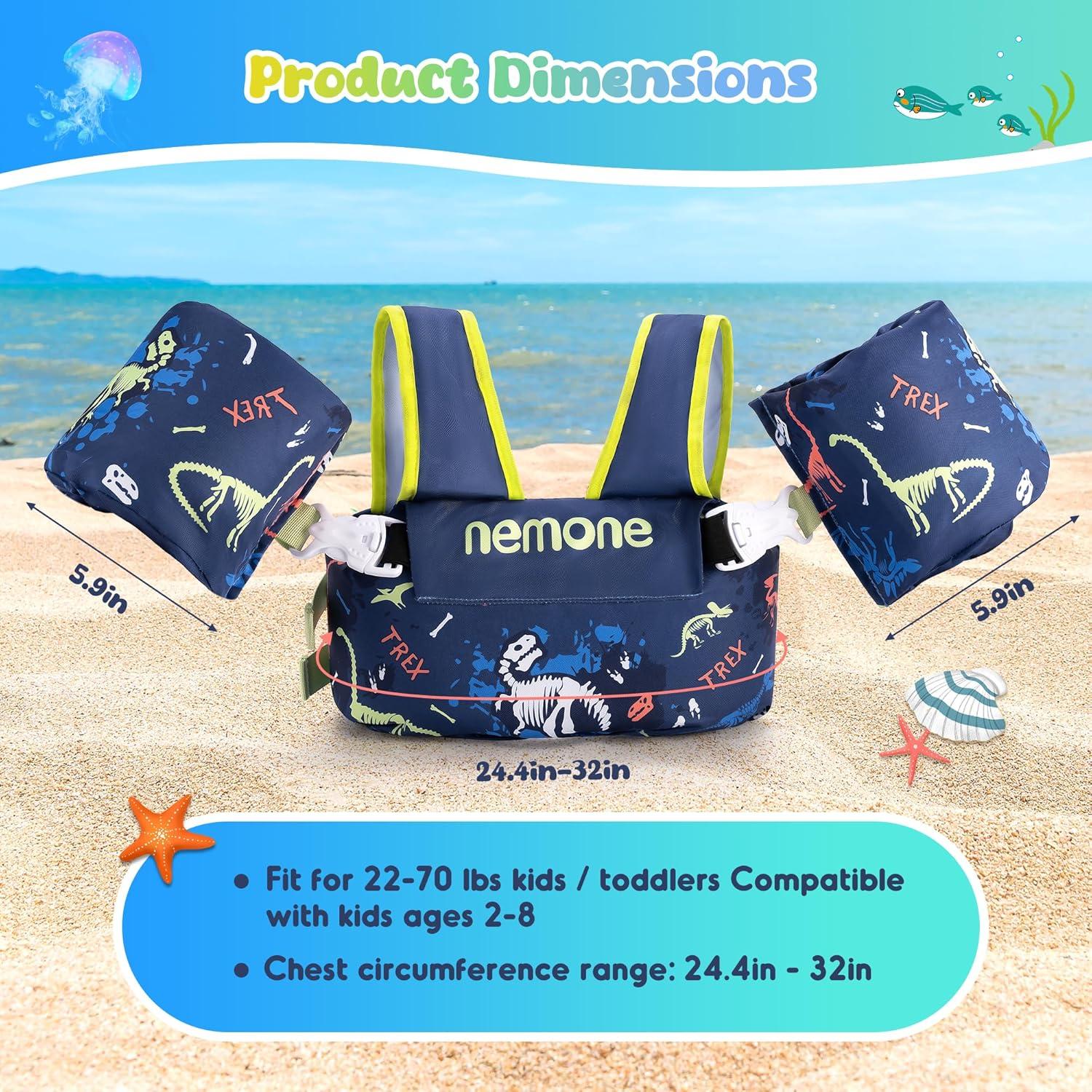 Nemone Toddler Swim Vest for 22-70 lbs Kids Floaties Swim Jacket with Arm Water Wings for Girls Boys 1 2 3 4 5 6 7 Years Old Beach Pool 20 30 40 50 60 66 Pounds Puddle Jumper(Cool Dinosaur)
