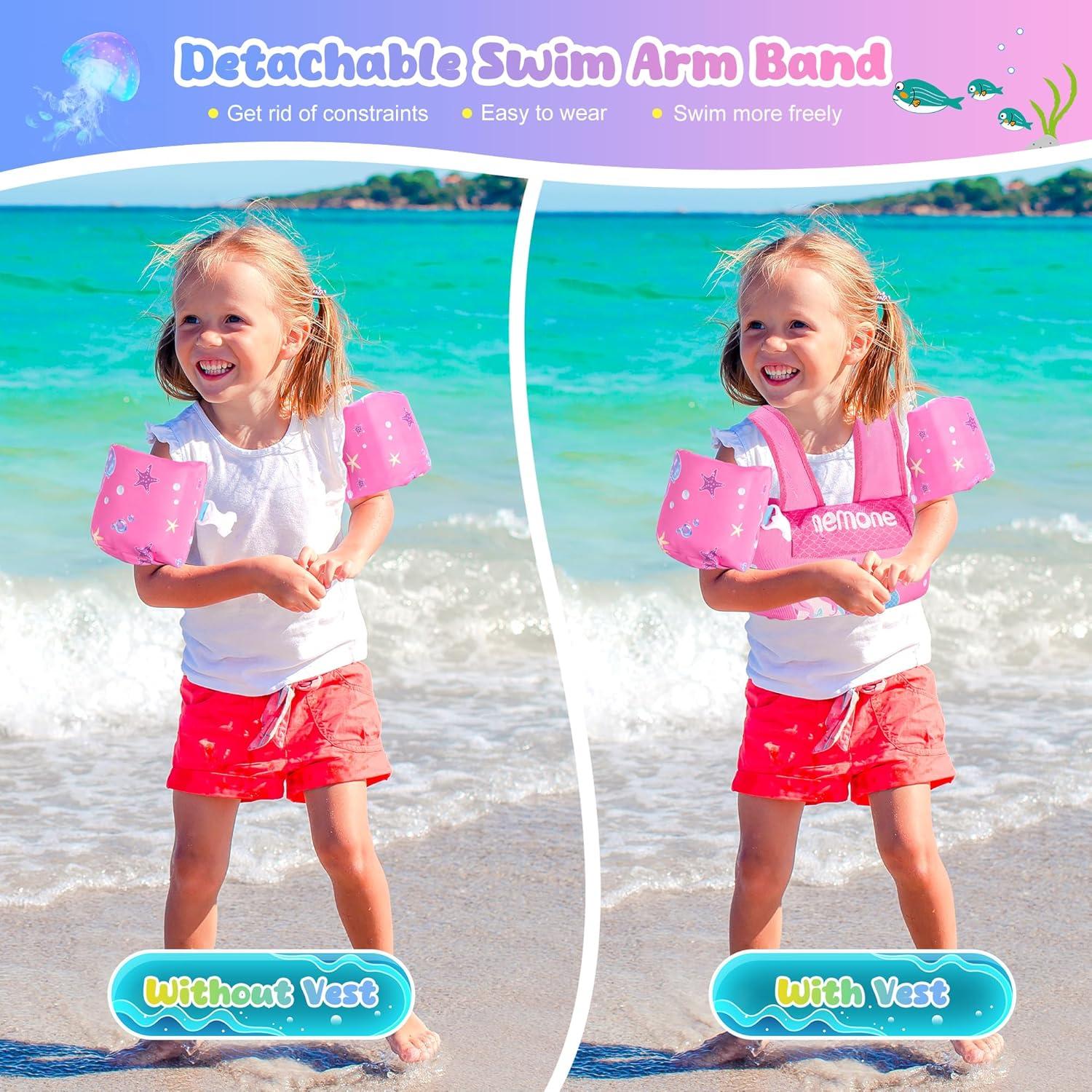 Nemone Toddler Swim Vest for 22-70 lbs Kids Floaties Swim Jacket with Arm Water Wings for Girls Boys 1 2 3 4 5 6 7 Years Old Beach Pool 20 30 40 50 60 66 Pounds Puddle Jumper(Pink Mermaid)